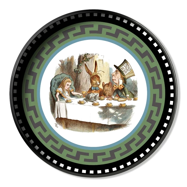 Bandeja redonda decorativa, metal barnizado con la imagen de la fiesta del te de «Alicia en el país de las maravillas». Diámetro 25 cm