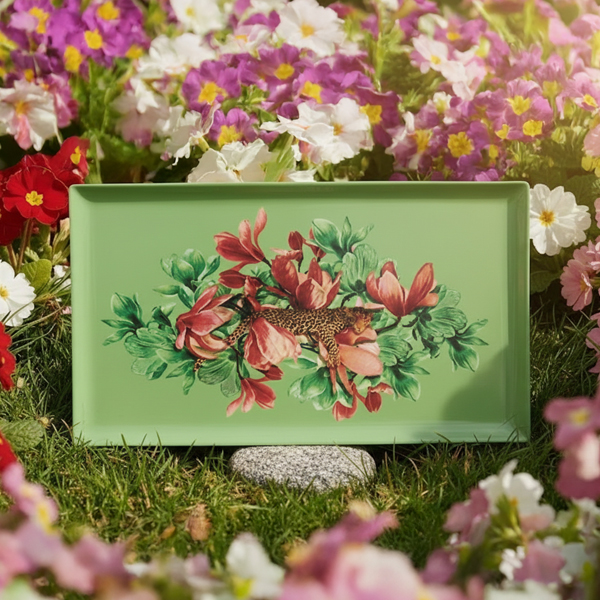 Esta bandeja de hierro acabado con esmalte pertenece a la colección Curiosito de Gangzaï.