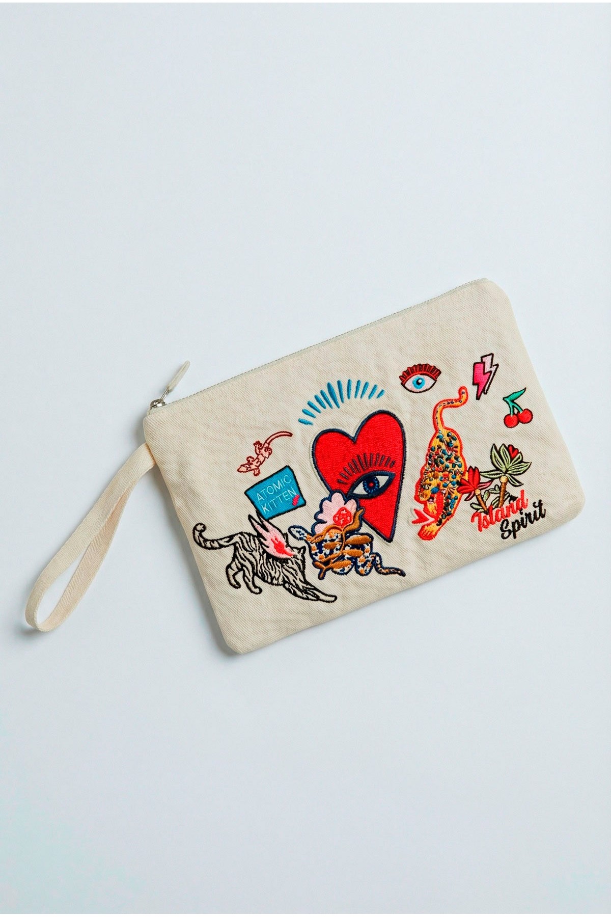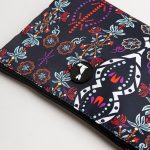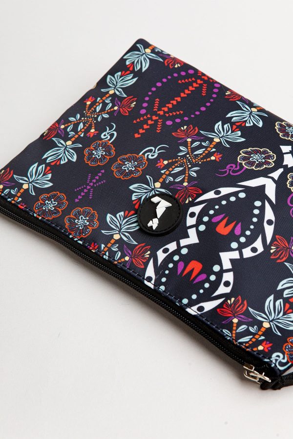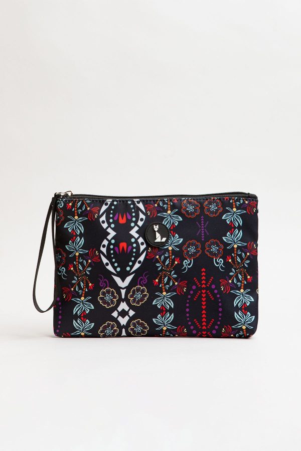Neceser con cierre de cremallera superior y asa de mano lateral. Detalle de parche circular con logo en el frontal. Estampado Boho multicolor sobre fondo negro.