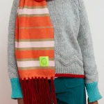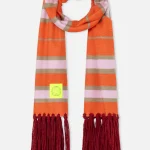 Bufanda larga con diseño de rayas de color en rosa, naranja y marrón. Detalle de flecos largos en color rojo en ambos extremos. Incluye etiqueta neón smiley.