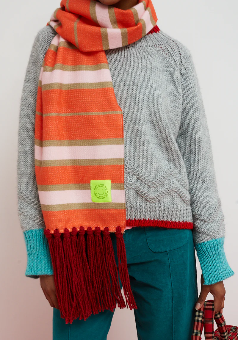 Bufanda larga con diseño de rayas de color en rosa, naranja y marrón. Detalle de flecos largos en color rojo en ambos extremos. Incluye etiqueta neón smiley.