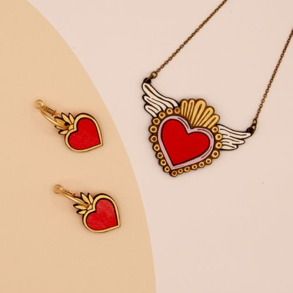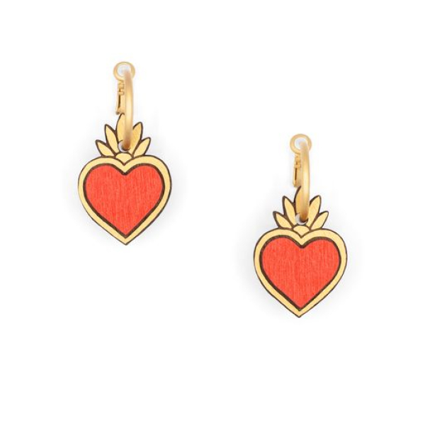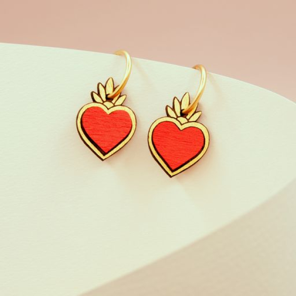 Pendientes con cierre de aro dorado y antialérgico, con corazones rojos pintados a mano. Hechos en madera cortada al láser, procedente de proveedores locales, en Barcelona.
