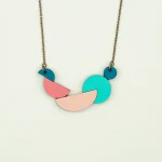 Collar con formas geométricas en colores complementarios. Pintado a mano en verde, turquesa y dos tonos de rosa.