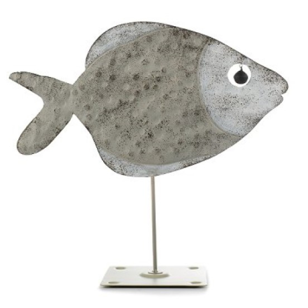 Figura decorativa de pez metálico con una base. Medidas: 30 x 28 cm.