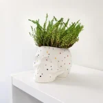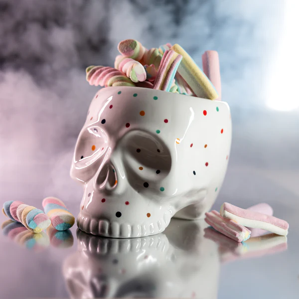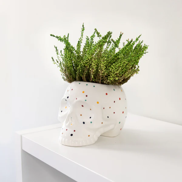 Con su color blanco y sus lunares de colores este macetero con forma de calavera es ideal para darle un toque a tu salón, oficina, habitación o jardín.