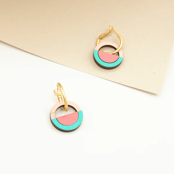 Pendientes de aro con diseño circular y colores complementarios, inspirados en el arte del movimiento Bauhaus.