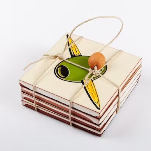 Juego de 4 posavasos de 10×10 cm, serigrafiados a mano. Cada azulejo tiene un reverso de terciopelo.