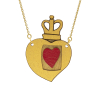 Un corazón dorado coronado que a su vez contiene otro corazón. Oro y rojo, colores que simbolizan el poder de la riqueza y el calor de la sangre que corre por nuestras venas. Un juego surrealista convertido en unos elegantes pendientes.